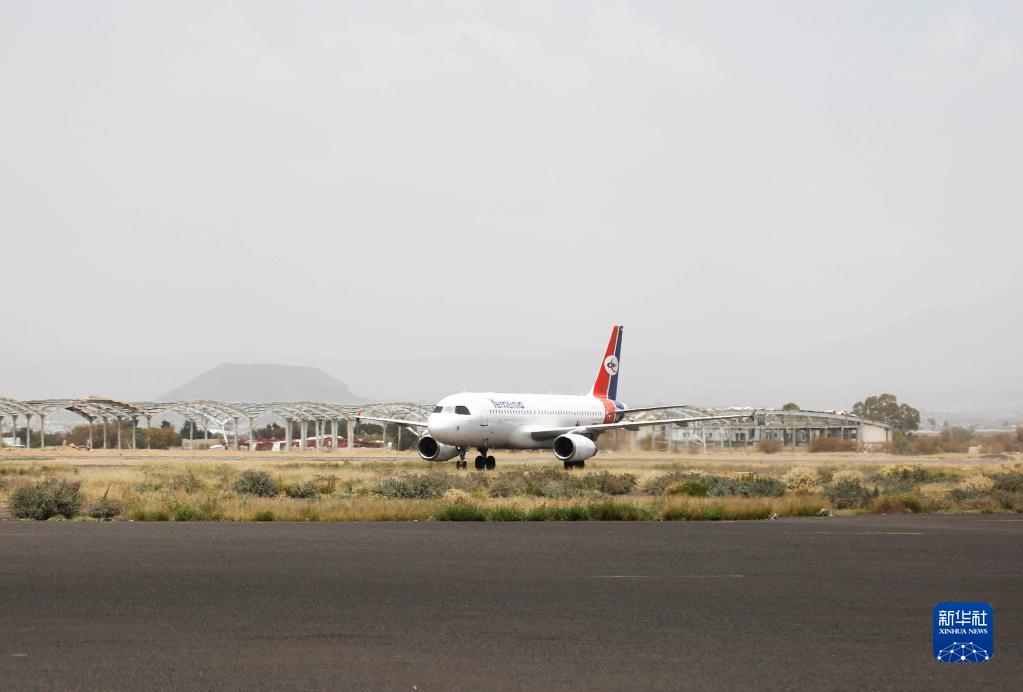 4月14日,搭载获释胡塞武装成员战俘的飞机抵达也门萨那机场。