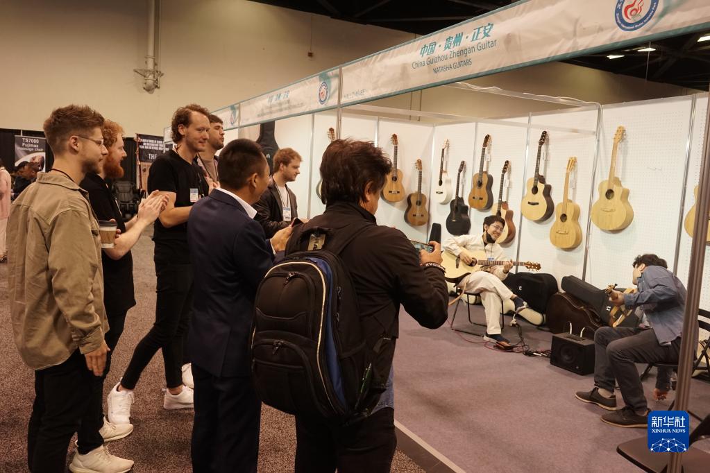 4月13日,在美国加利福尼亚州阿纳海姆会展中心,参观者在中国贵州正安吉他产业园一家公司展位观看乐器表演。