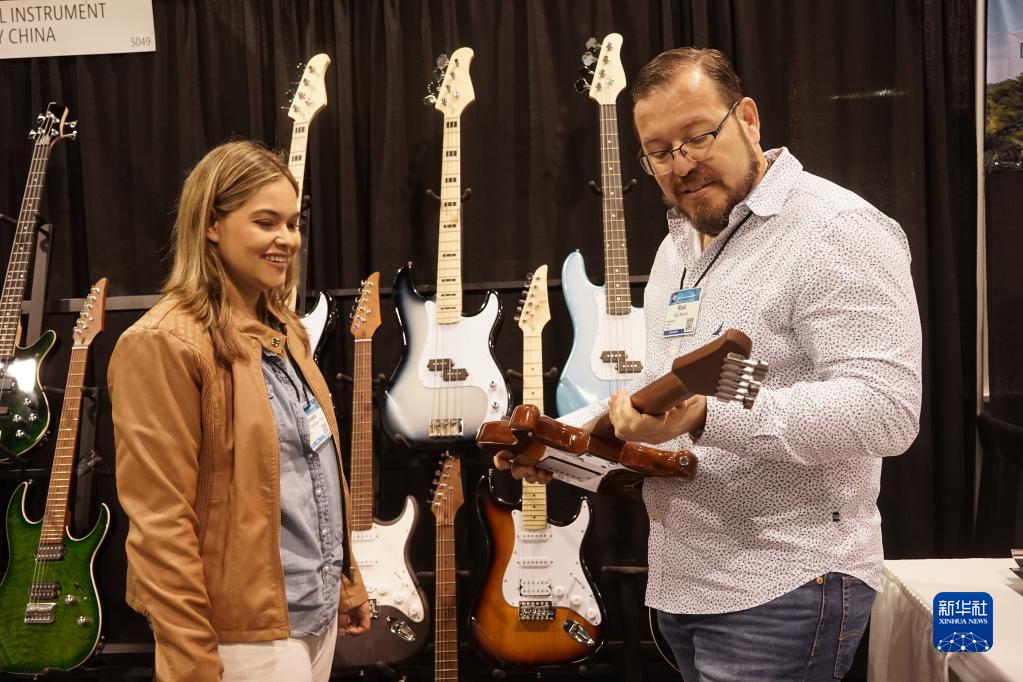 4月13日,在美国加利福尼亚州阿纳海姆会展中心,参观者在中国贵州正安吉他产业园一家公司展位观看乐器。