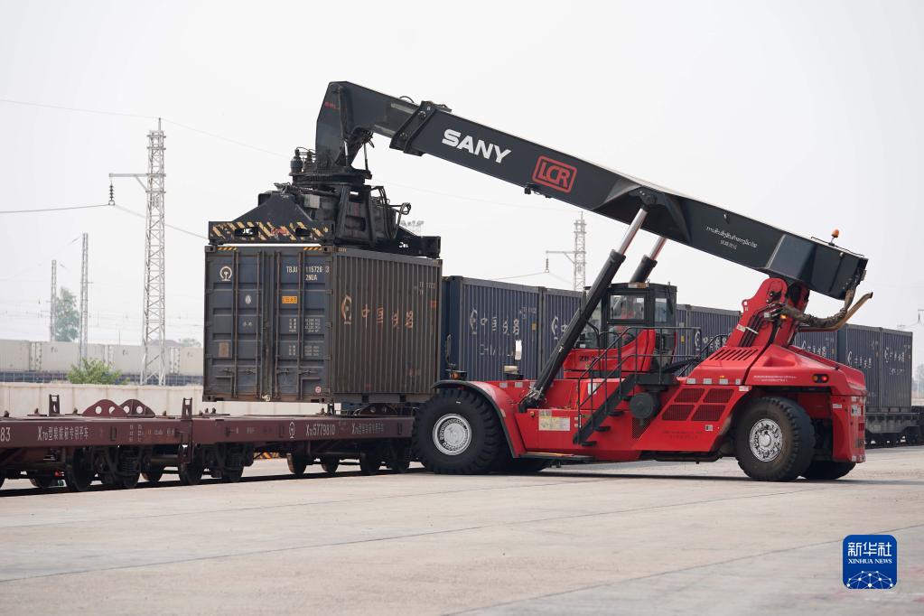 4月15日,老中铁路公司的员工在老挝万象南站装运货物。