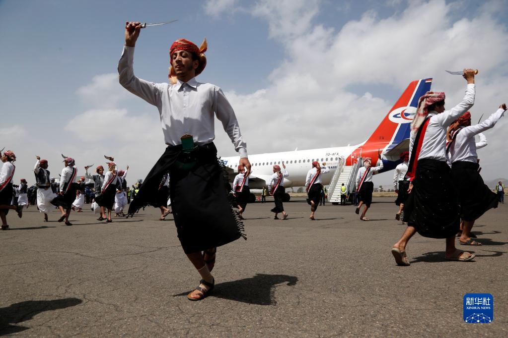 4月15日,在也门萨那机场,人们在欢迎战俘归来的仪式上跳舞。