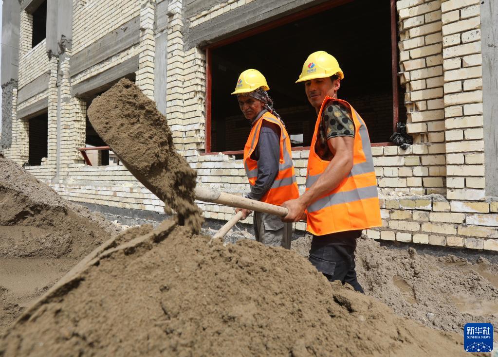 4月9日,在伊拉克巴格达省,中国和伊拉克工人在一处示范学校项目施工现场工作。新华社发(哈利勒·达伍德摄)