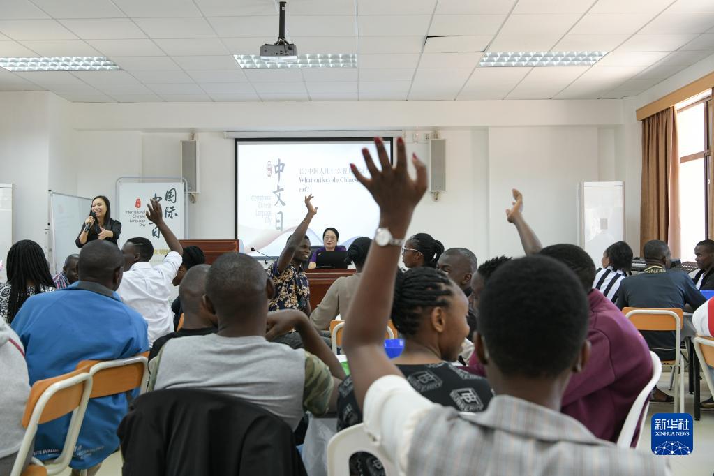 4月18日,肯尼亚学生在内罗毕大学孔子学院举办的活动上进行互动问答。