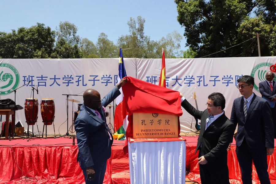 4月18日,在中非共和国班吉大学,中非共和国高等教育、科研和技术创新部部长让·洛朗·西萨-马加莱(左)和中国驻中非共和国大使李钦峰为孔子学院揭牌。(新华社发,史第文摄)