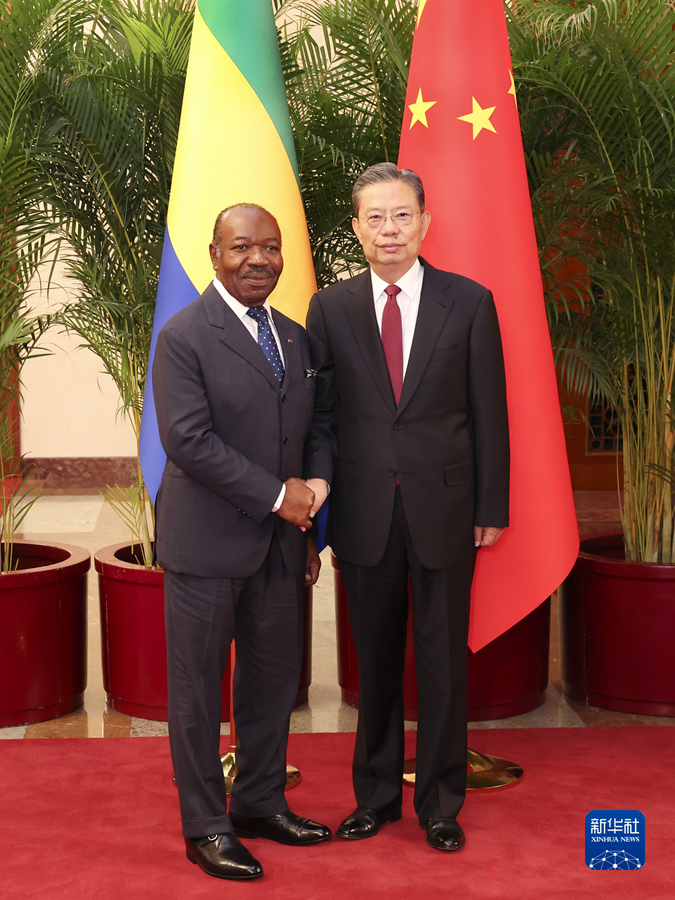 新华社北京4月19日电 全国人大常委会委员长赵乐际19日在人民大会堂会见加蓬总统邦戈。