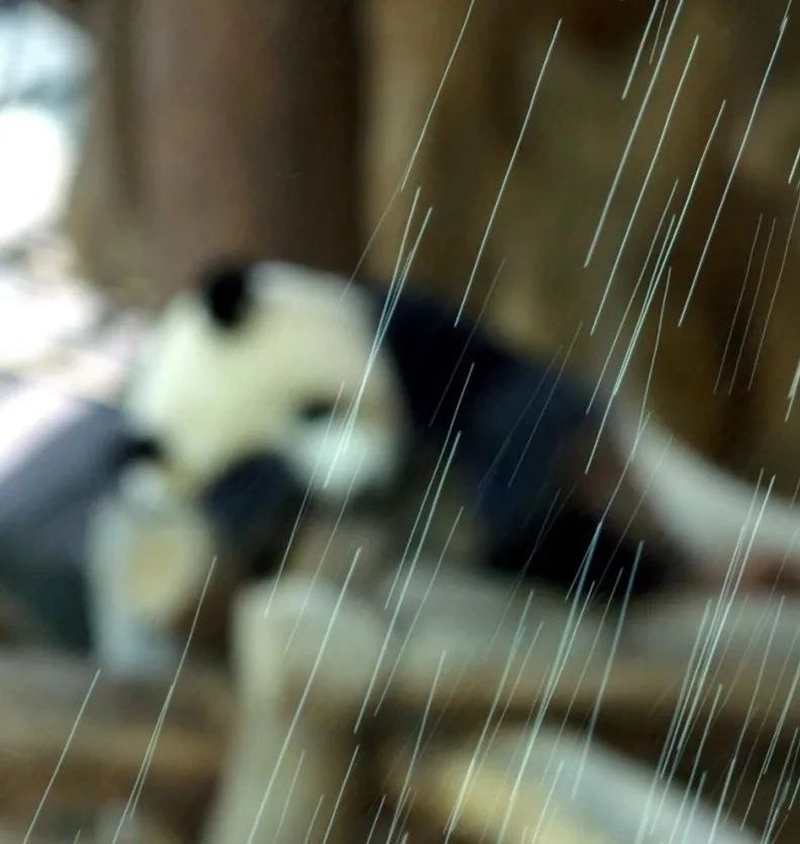2006年1月12日,清迈动物园熊猫馆正在模拟下雨环境,“林惠”在雨中睡觉。