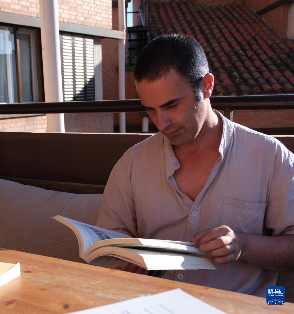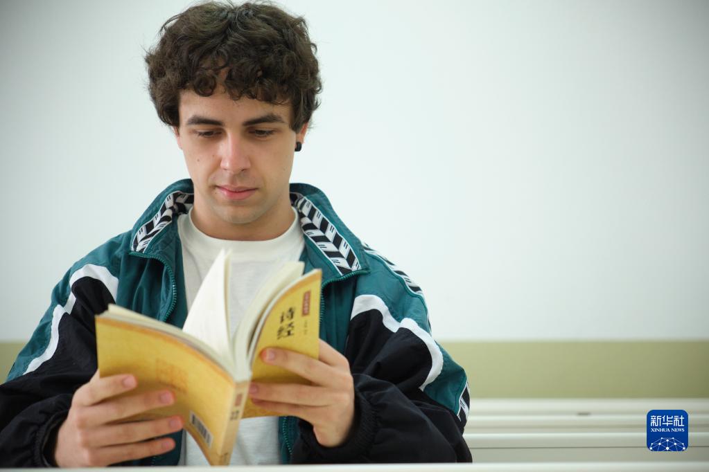 4月17日,胡里奥在西班牙马德里自治大学的教室内阅读诗经。新华社记者 孟鼎博 摄