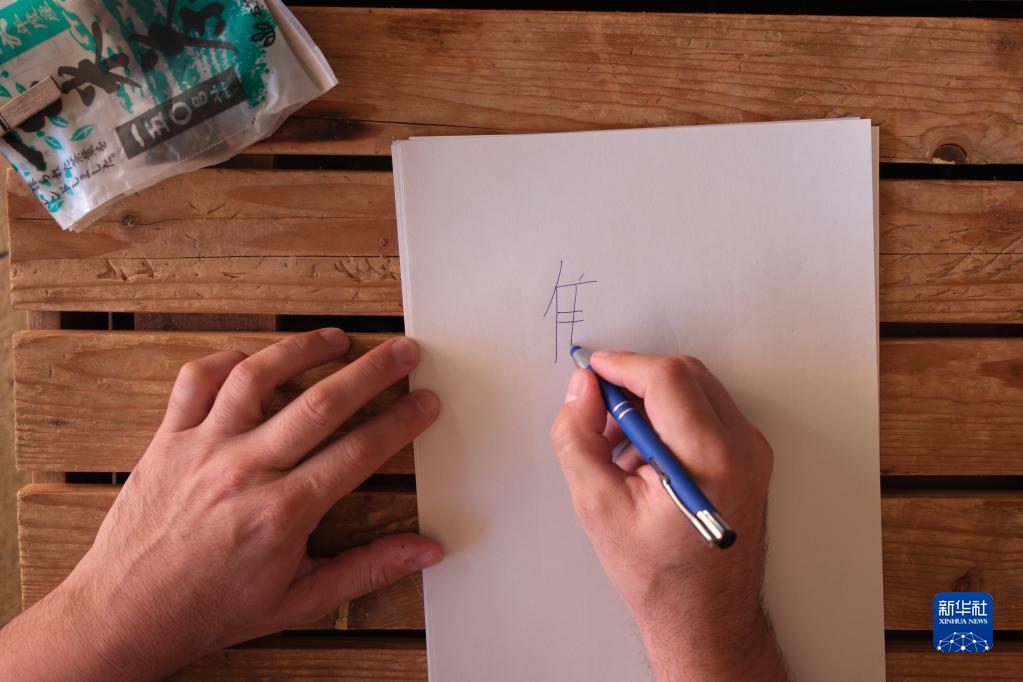 4月18日,米格尔在西班牙马德里的家中书写汉字。新华社记者 孟鼎博 摄