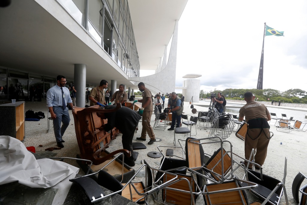 1月9日,在巴西首都巴西利亚,工作人员清理总统府普拉纳尔托宫遭到破坏的家具。新华社发(卢西奥·塔沃拉摄)