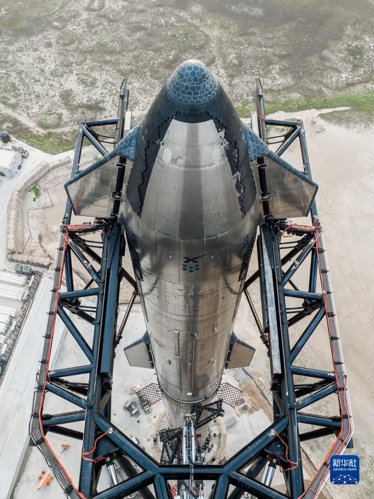 这张4月11日公布的图片显示,美国太空探索技术公司的新一代重型运载火箭“星舟”以及飞船集成系统在位于得克萨斯州的一处发射基地等待升空。