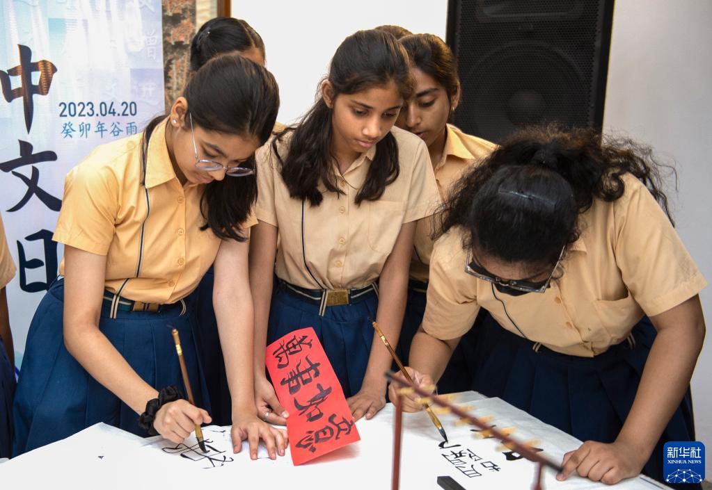 4月20日,印度青少年在位于新德里的中国驻印度大使馆参加天宫对话——神舟十五号航天员乘组与上海合作组织国家青少年问答活动时书写中文。