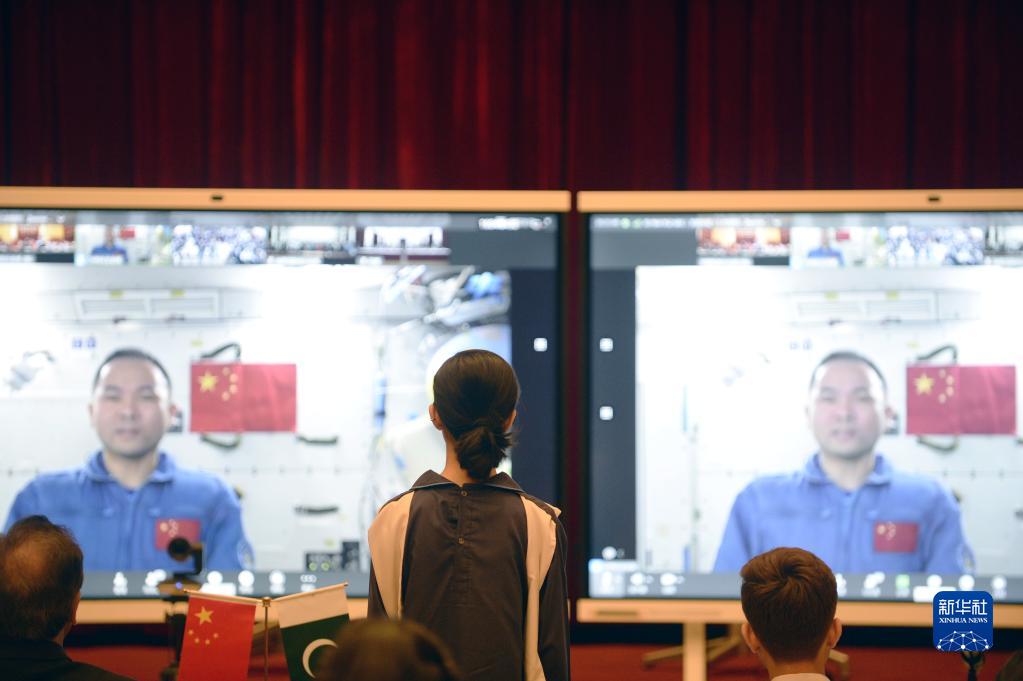 4月20日,巴基斯坦青少年在位于伊斯兰堡的中国驻巴基斯坦大使馆参加天宫对话——神舟十五号航天员乘组与上海合作组织国家青少年问答活动时向中国航天员提问。