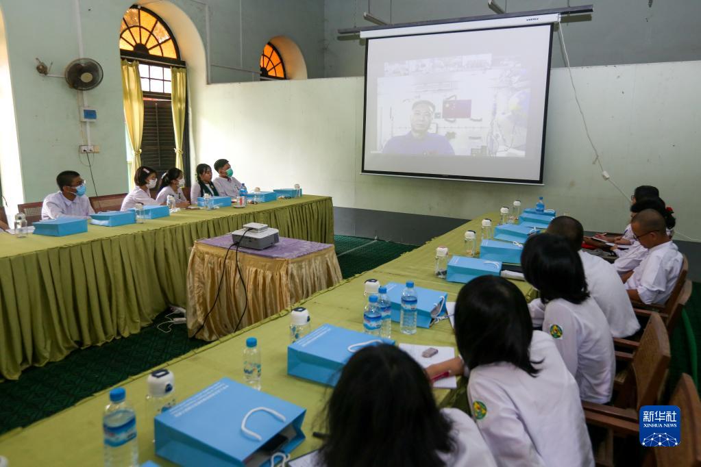 这是4月20日在缅甸仰光一所高中拍摄的“天宫对话”活动线上课堂现场。