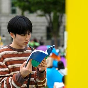 4月23日,一名男子在韩国首尔广场上阅读图书。