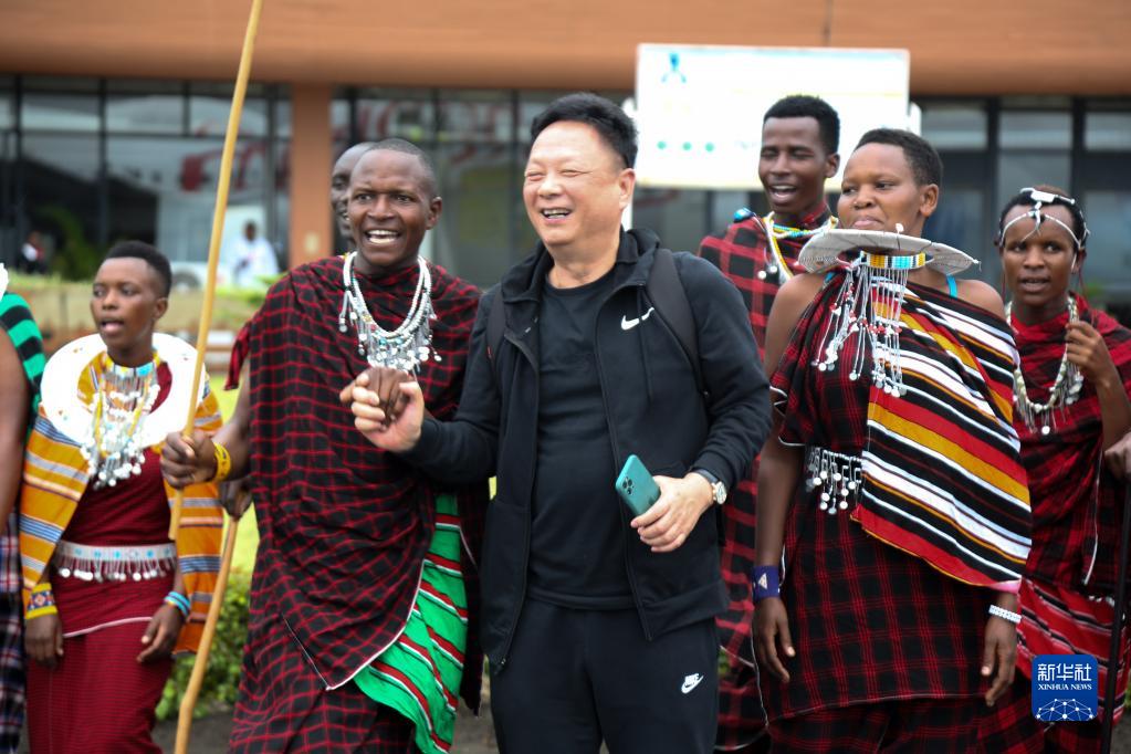 4月22日,在坦桑尼亚乞力马扎罗国际机场,中国游客与身着坦桑尼亚传统服饰的当地人合影。