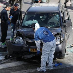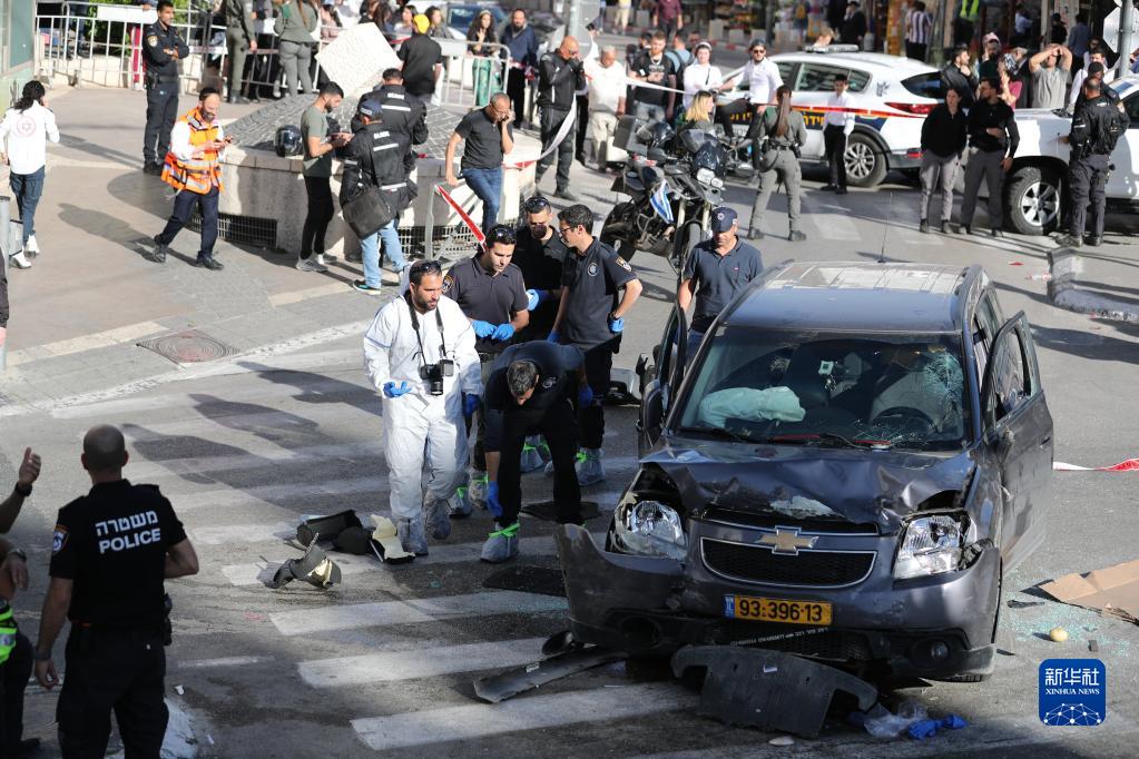 4月24日,警察在耶路撒冷驾车袭击事件现场工作。新华社发(穆阿马尔·阿瓦德 摄)