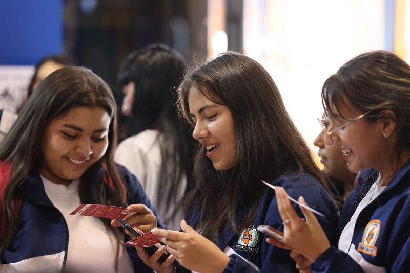 在塔德奥大学孔子学院的展位上,几个女学生拿到写着自己中国名字的书签非常开心。记者唐薇 摄