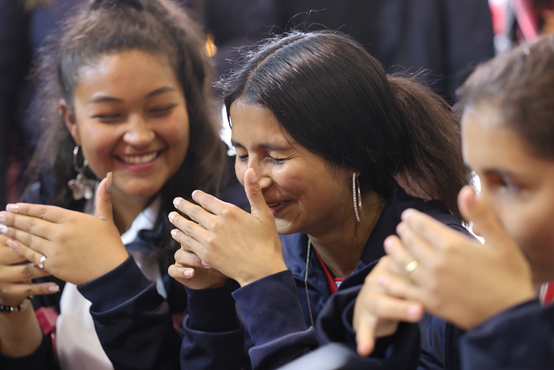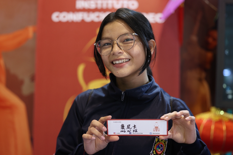 一位女生兴奋地向记者展示塔德奥大学孔子学院中文老师用中文给她写的名字。记者唐薇 摄
