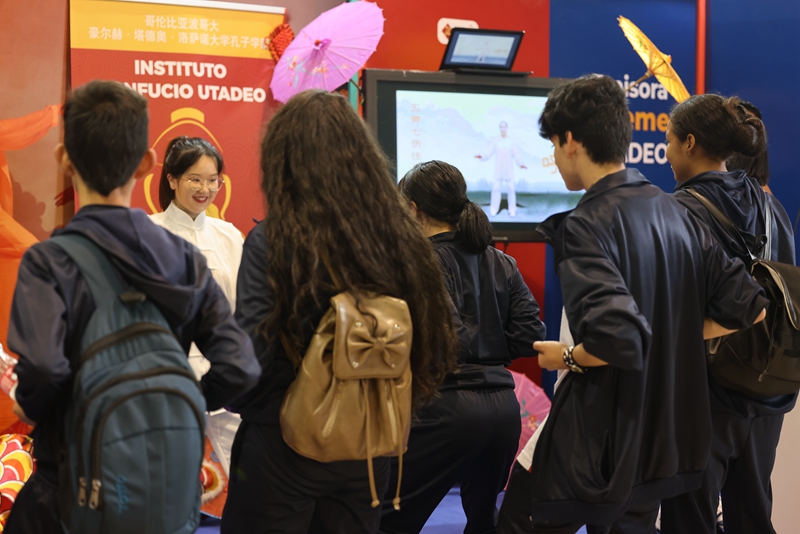 参加书展的学生跟着塔德奥大学孔子学院的老师练习八段锦。记者唐薇 摄