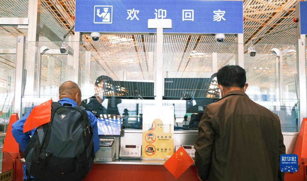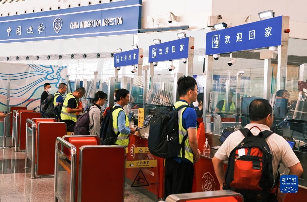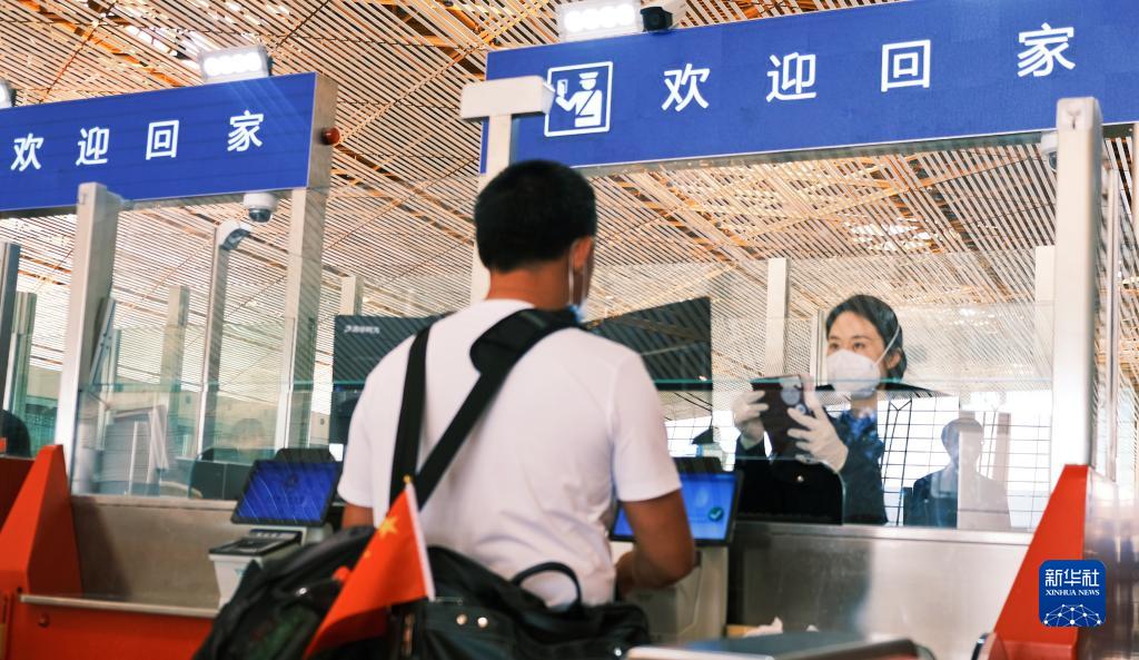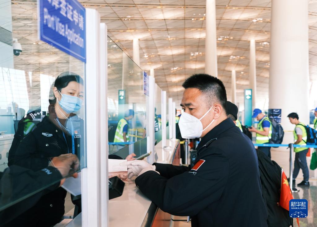 4月29日,在北京首都国际机场,北京边检总站民警为入境公民办理手续。新华社发(王春晖摄)