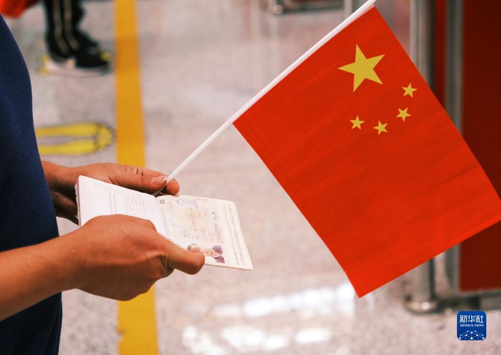 4月29日,在北京首都国际机场,一位拿着国旗和护照的公民等待入境。新华社发(王春晖摄)