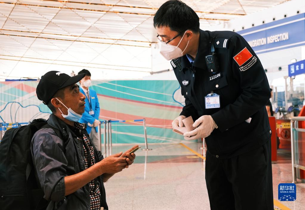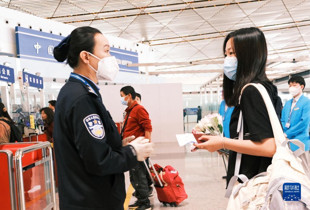 4月29日,在北京首都国际机场,北京边检总站民警与入境公民交流。新华社发(王春晖摄)