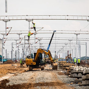 5月1日,在印度尼西亚万隆,建设者在雅万高铁德卡鲁尔动车所施工现场作业。
