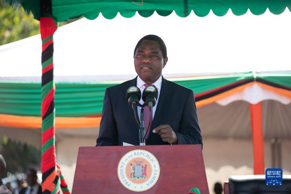 5月1日,在赞比亚首都卢萨卡,赞比亚总统希奇莱马在“五一”国际劳动节游行活动上讲话。