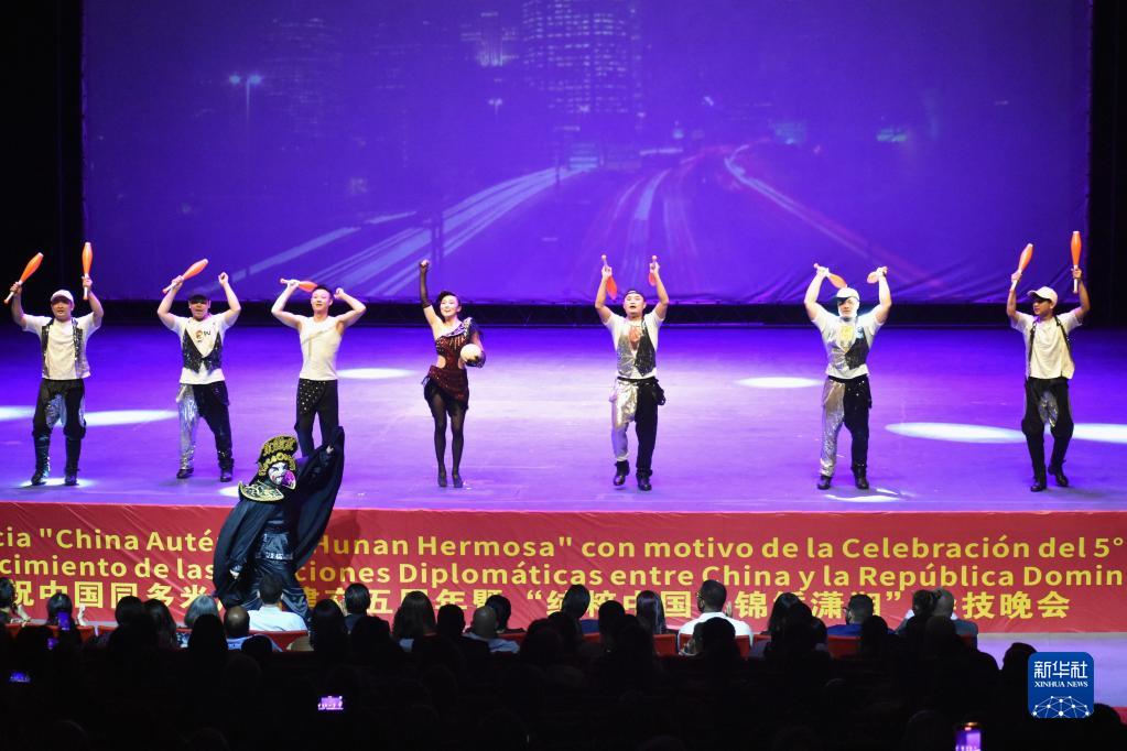 为庆祝中多两国建交五周年,湖南省杂技艺术剧院演出团当晚为多米尼加各界友人、中资机构和华侨华人代表1000余人带来一场艺术盛宴。这是新冠疫情后多米尼加迎来的首个中国文艺演出团,也是疫情三年来湖南省派出的首支对外文化交流团。