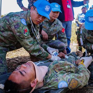 5月3日,在黎巴嫩南部边境“蓝线”附近雷场,参与演习的中国第21批赴黎巴嫩维和多功能工兵分队医疗组对“伤员”伤情进行前期处置。