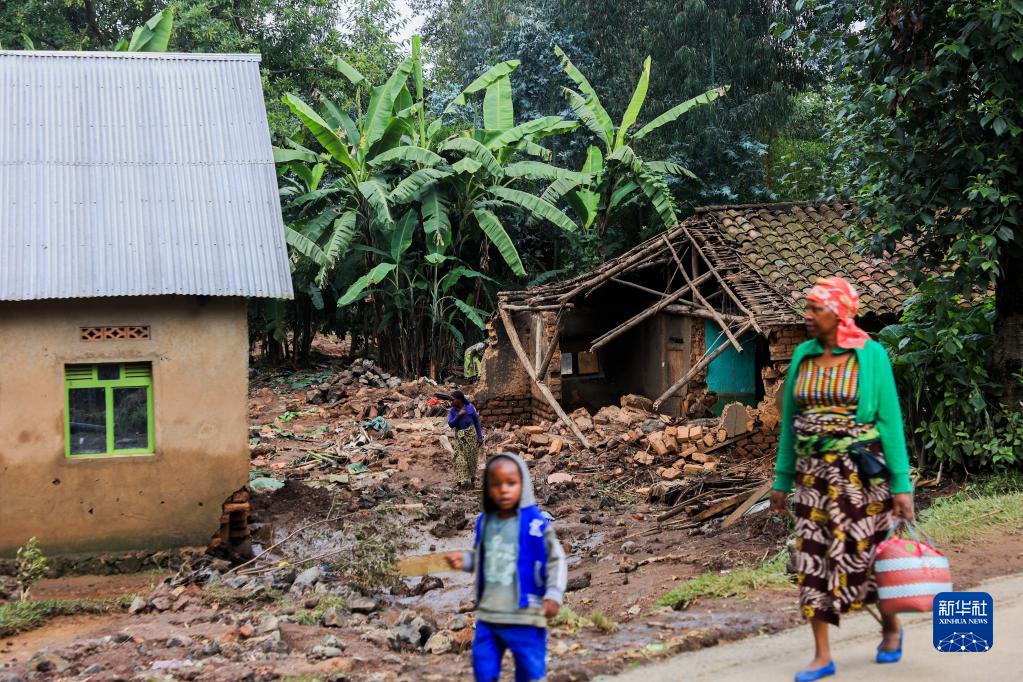 5月4日,在卢旺达西方省,人们经过在强降雨和洪水中受损的房屋。