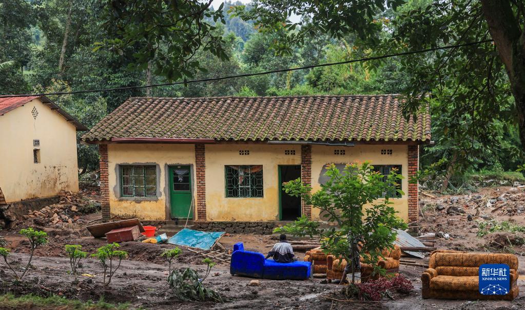 5月4日,居民坐在卢旺达西方省一处受损的房屋旁。