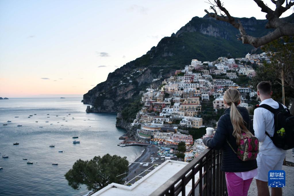 5月3日,游客欣赏落日余晖下的意大利阿马尔菲海岸线。