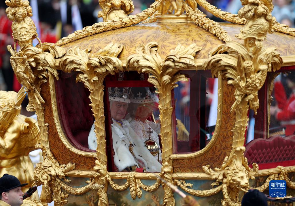 5月6日,在英国伦敦,英国国王查尔斯三世和王后卡米拉乘马车从威斯敏斯特教堂返回白金汉宫。新华社记者 李颖 摄