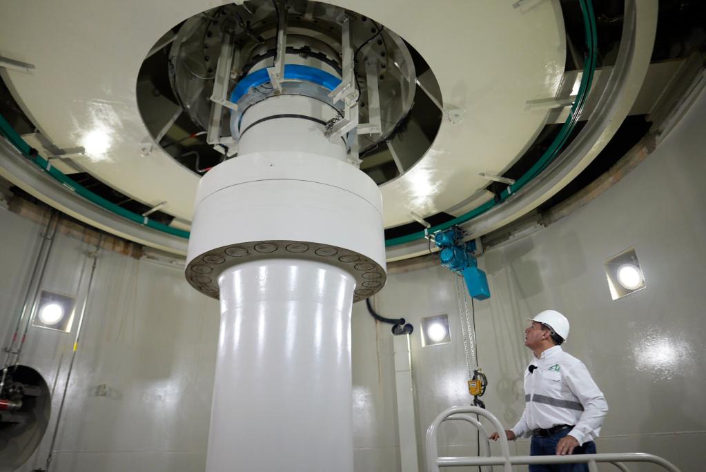 4月28日,在洪都拉斯帕图卡三水电站内,水电站运营总经理内尔松·奥尔特加检查设备运行状况。新华社发(戴维·德拉帕斯摄)