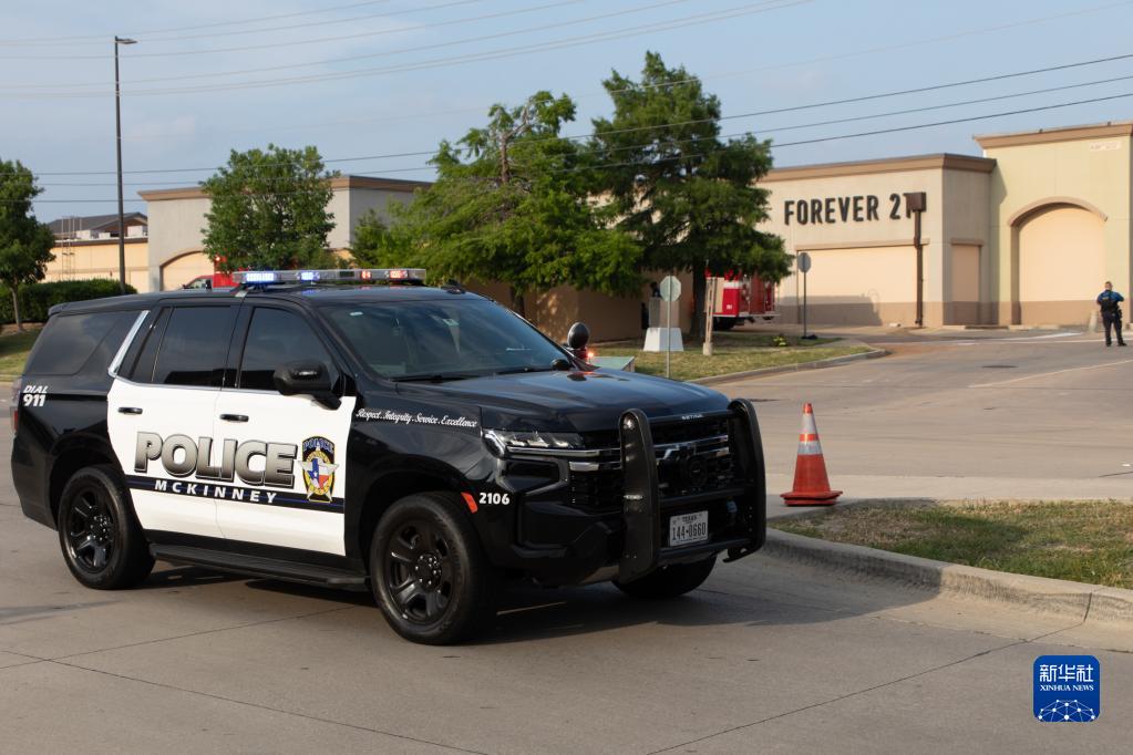 5月6日,警车停在美国得克萨斯州达拉斯近郊发生枪击事件的购物中心附近。新华社发(田丹摄)