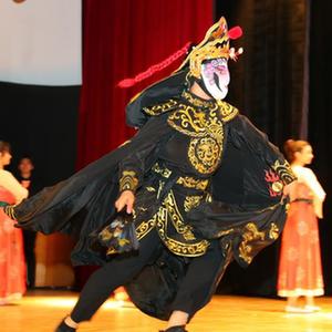 5月8日,开罗大学学生卢埃·阿德尔·穆罕默德在埃及伊斯梅利亚省的苏伊士运河大学举办的“汉语桥”世界大学生中文比赛埃及赛区决赛上表演川剧变脸。新华社记者隋先凯摄