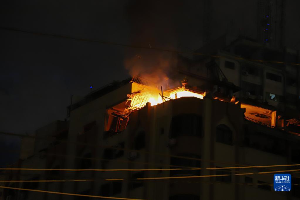 这是5月9日在加沙城拍摄的遭到空袭后失火的建筑。新华社发(里泽克·阿卜杜勒贾瓦德摄)