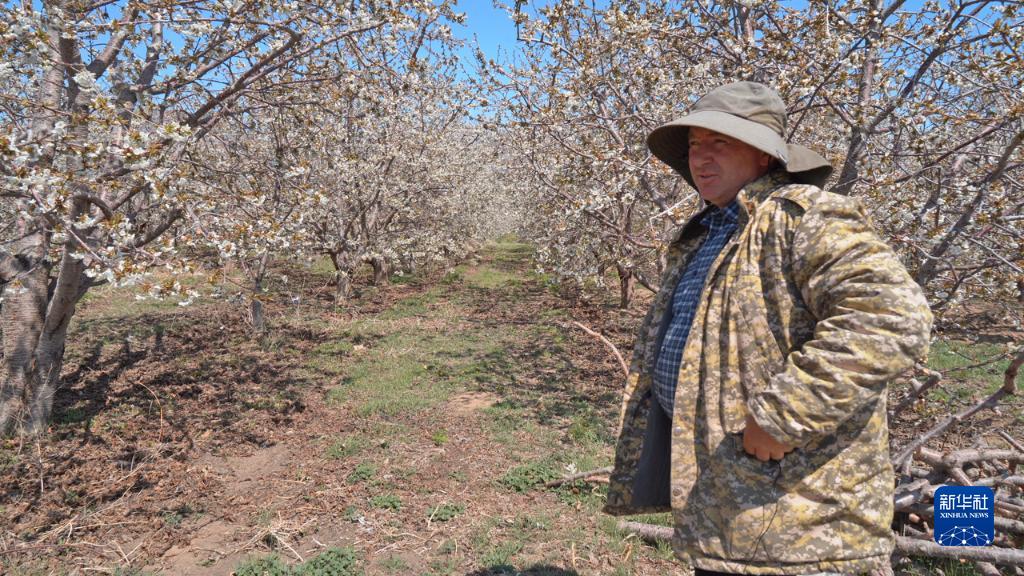 4月24日,在吉尔吉斯斯坦卡拉奥伊村,村民叶夫根尼·雅科夫列夫站在自家栽种的果树前。新华社发(钦吉斯 摄)