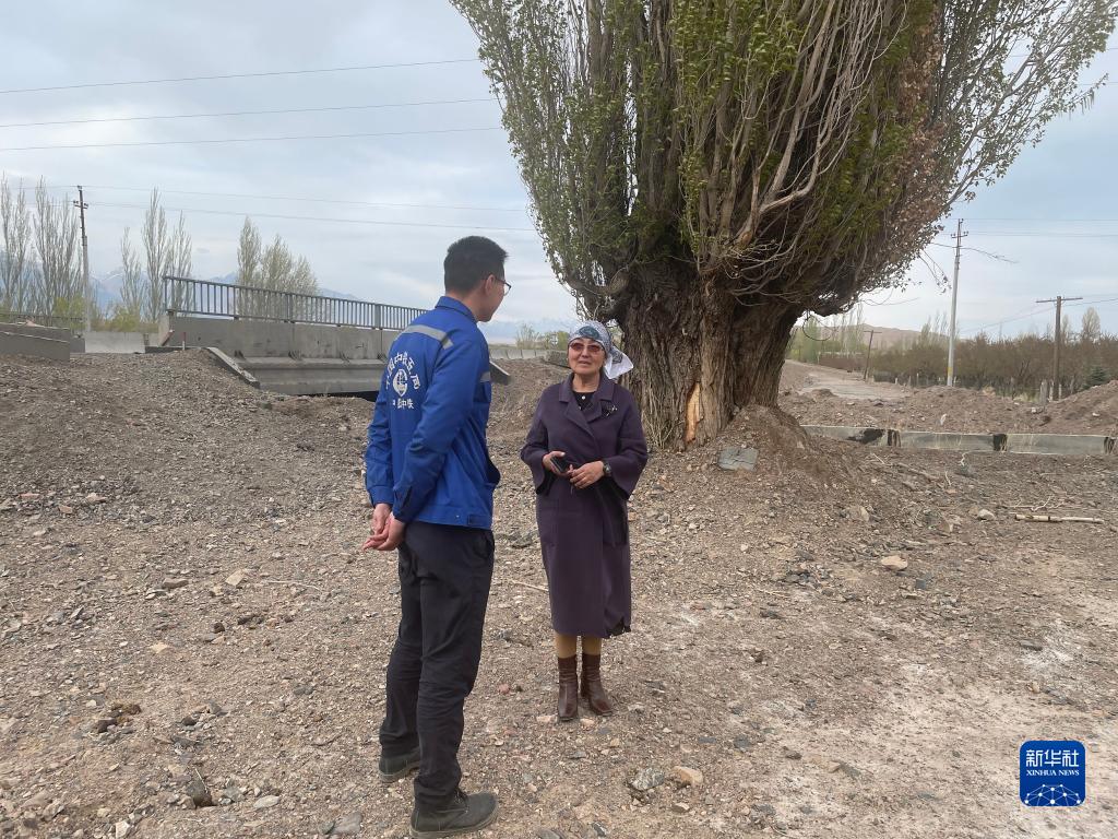 4月25日,在吉尔吉斯斯坦阿克奥隆村,中铁五局工作人员王尹琛(左)与阿克奥隆村前村委会主任玛伊拉姆·卡迪拉列娃在一处水渠旁交谈。新华社记者 关建武 摄