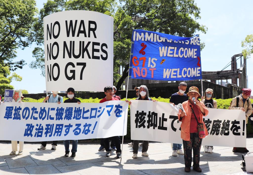 5月14日,在日本广岛街头,日本民众举着“不要战争、不要核武器、不要G7”等标语,强烈抗议七国集团(G7)峰会将在广岛召开。新华社记者杨光摄