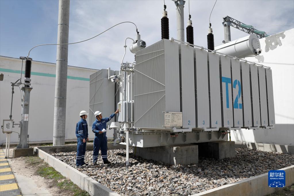 4月3日,在哈萨克斯坦札纳塔斯,阿比尔加济耶夫(右)与同事检查风电场变压设备。