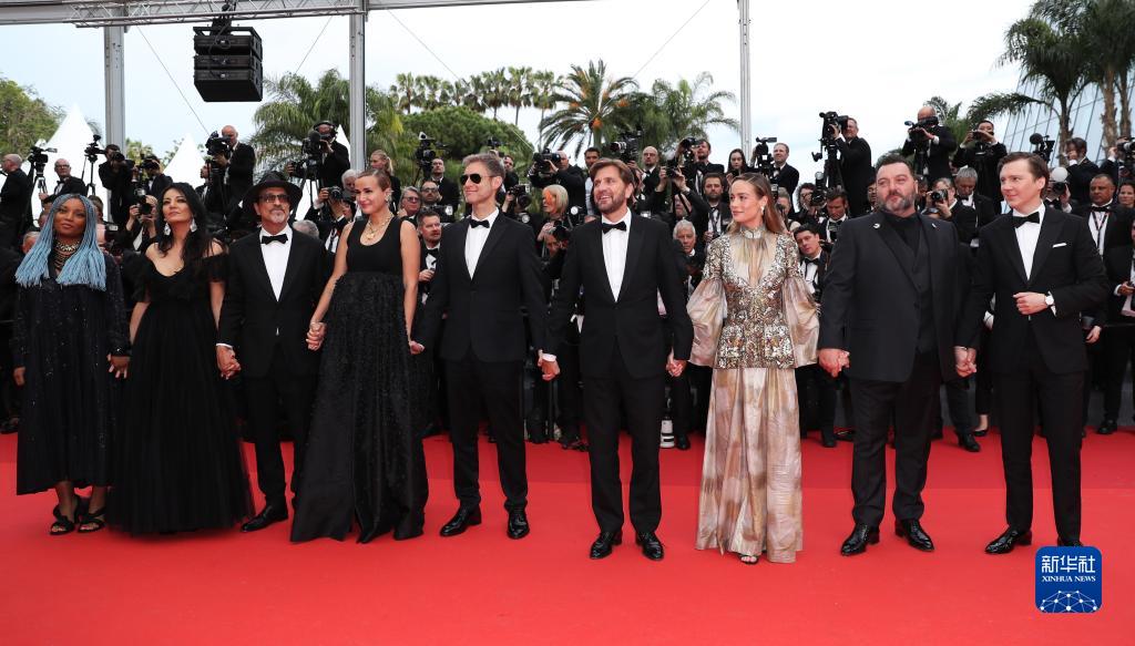 5月16日,在法国戛纳举行的第76届戛纳国际电影节上,主竞赛单元评审团主席、瑞典导演鲁本·奥斯特伦德(右四)携众评委亮相开幕式红毯。