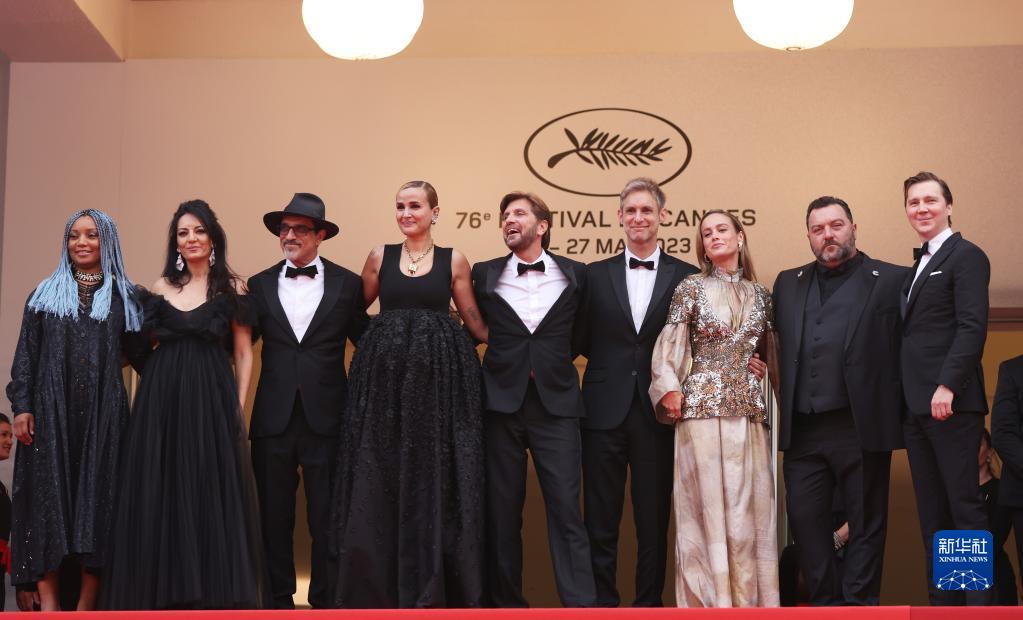 5月16日,在法国戛纳举行的第76届戛纳国际电影节上,主竞赛单元评审团主席、瑞典导演鲁本·奥斯特伦德(中)携众评委亮相开幕式红毯。