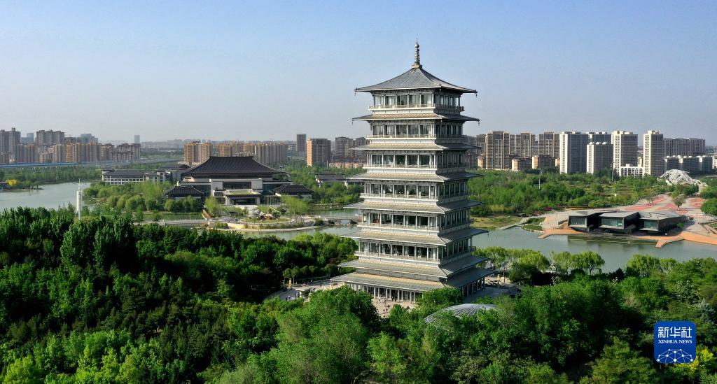 位于西安浐灞生态区的长安塔(4月16日摄,无人机照片)。