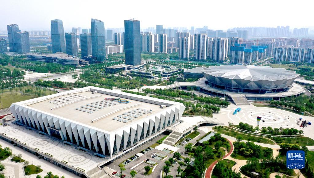 位于西安国际港务区的西安奥体中心(4月26日摄,无人机照片)。