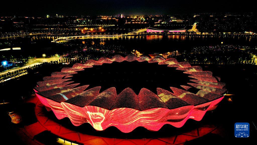 位于西安国际港务区的西安奥体中心(5月1日摄,无人机照片)。