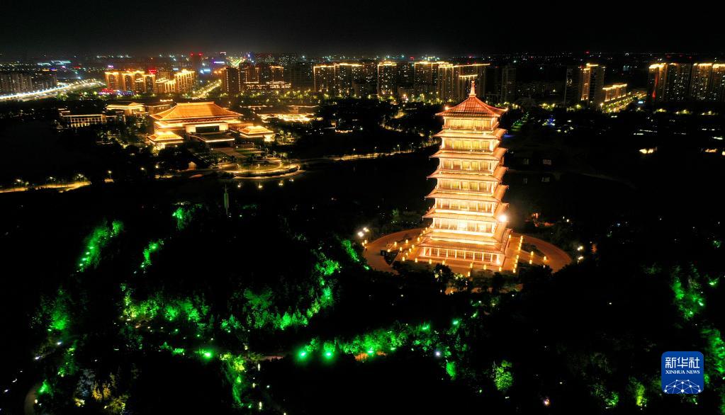 位于西安浐灞生态区的长安塔(5月1日摄,无人机照片)。