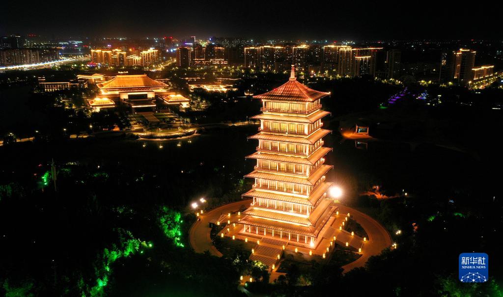 位于西安浐灞生态区的长安塔(5月1日摄,无人机照片)。