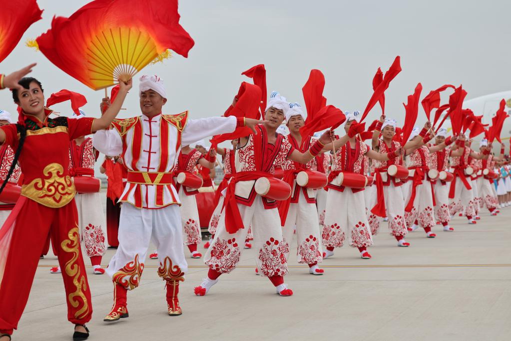 5月17日下午,当地民众在西安咸阳国际机场以热情的腰鼓、欢快的秧歌等民间艺术表演欢迎中亚国家贵宾到来。新华社记者邢广利 摄